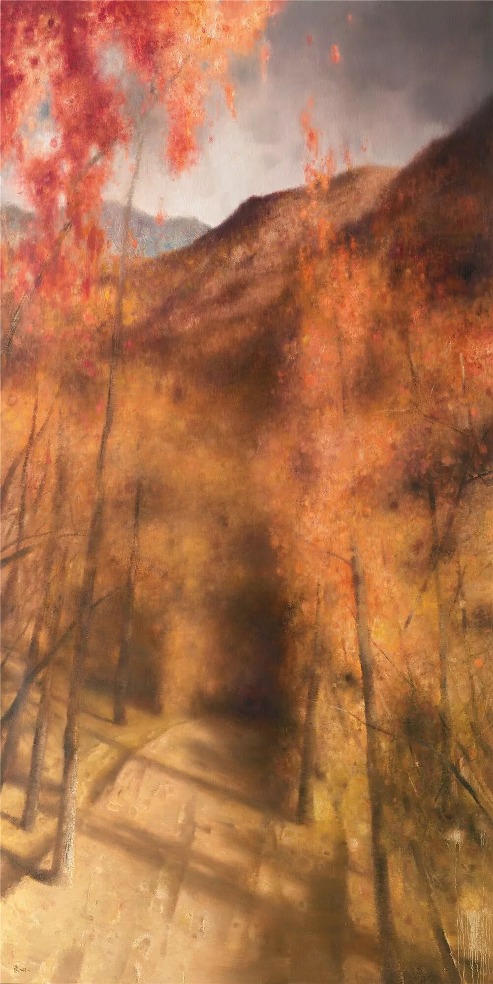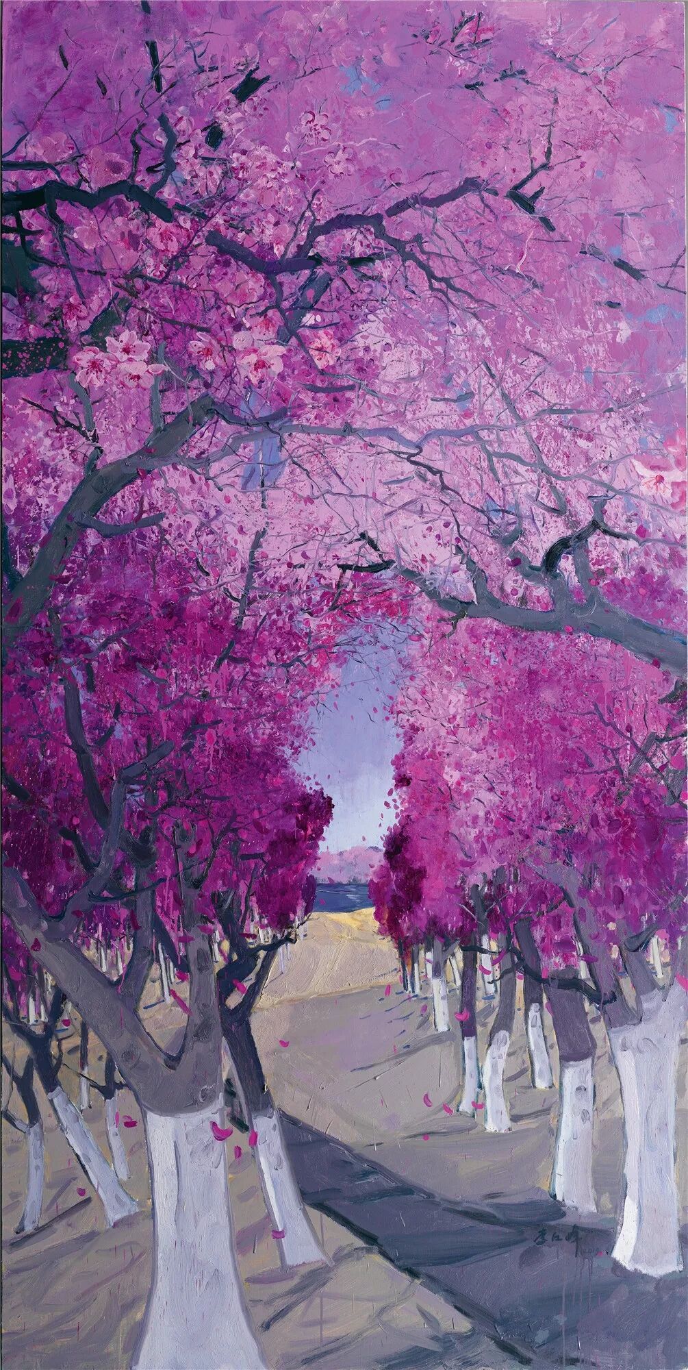 艺术家以即将投入使用的北京大兴国际新机场为题。画面中近景花簇,素装淡裹,晶莹皎洁,远处新机场的古铜色屋顶在薄雾中若隐若现,从建筑中心放射出的5条指廊,犹如凤凰的翅膀。