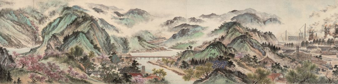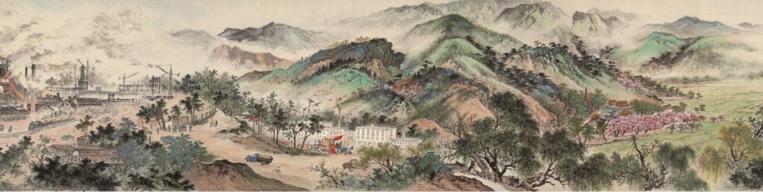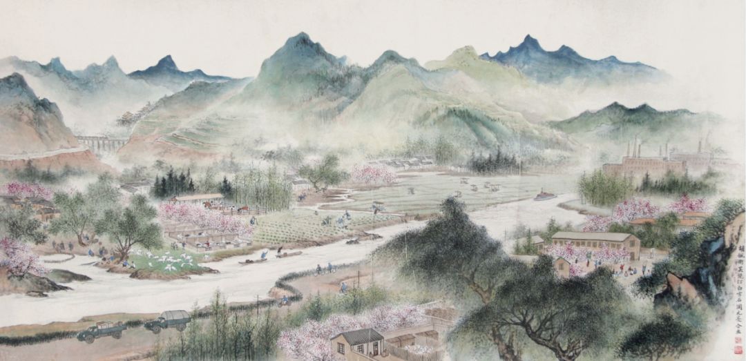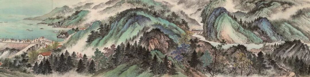 《山村春浓》 胡佩衡、吴镜汀、周元亮、白雪石 63×131 cm 纸本设色 北京画院藏