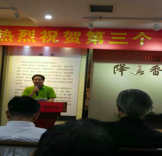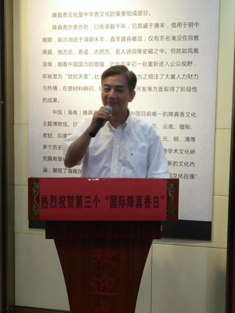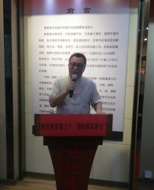 第三届国际降真香日及合作签约仪式在优美动听的《梅花三弄》、《高三流水》古筝演奏曲后,国际降真香联盟发起人、中国海南降真香协会、中国海南降真香博物馆馆长刘宏智先生致欢迎词。会长刘宏智指出:降真香历史文化永久、药用价值极高、断代几百年后又出现在世人面前,这是上天给与的恩赐,加强降真香宣传和保护任重而道远,迫在眉睫,也是大家共同的责任。刘宏智提到在去日本香文化交流时,送给日本德川美术馆一根降真香,德川美术馆馆长在百忙中抽出时间接见刘会长一行并激动的说:降真香在德川美术馆有四根,视为国宝,受到世界参观者惊叹,感谢刘会长把这珍贵的礼物赠送德川美术馆。