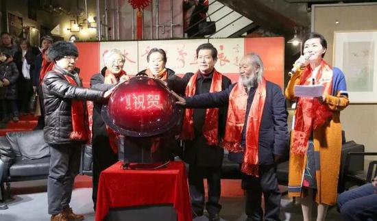 最后,喻继高先生、言恭达先生、周积寅先生、丁帆先生、徐培晨先生共同按下启动球,“惊起一滩鸥鹭——纪太年工笔画展”正式拉开序幕。