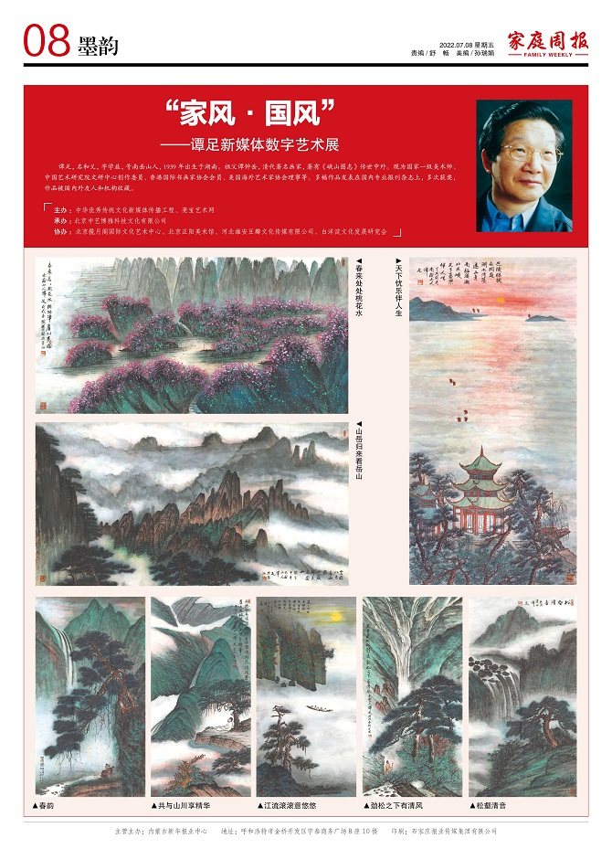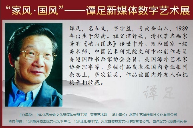2022年7月8日,“家风·国风”——谭足新媒体数字艺术展开幕。该展览由中华优秀传统文化新媒体传播工程、亮宝艺术网主办,北京中艺博雅科技文化有限公司承办,北京揽月阁国际文化艺术中心、北京正阳美术馆、河北雄安豆瓣文化传媒有限公司、白洋淀文化发展研究会协办。