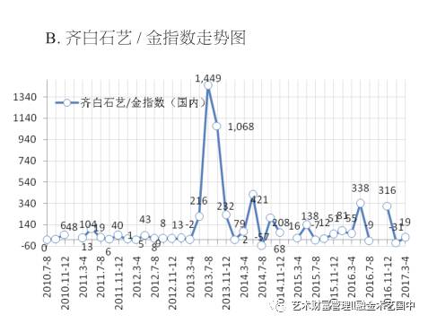 “艺/金指数”认为,以黄金价格度量艺术品投资收益更为客观,将艺术品价格涨跌与金价涨跌做比照,更能反映艺术品投资的实际收益。不同于其他指数以货币衡量艺术品投资回报,而是以金价为尺度,从而剔除了货币通胀因素,更真实地反映了艺术品的增值能力,反映了艺术品投资收益的实际波动,可以帮助投资者理性看待艺术品资产的增值能力。该指数计算方法为:首先,用前述特征价格法计算当期艺术品价格相对于基期的增幅,即名义投资收益率;同时,计算当期黄金价格相当于基期的增幅;然后,计算艺术品价格增幅与黄金价格涨幅的比值,即艺术品以黄金计价的投资收益。由于国内、国际金价增幅有所差异,依据上海黄金交易所发布的上海金、伦敦国际金融期货交易所的伦敦金作为国内、国际金价标准,分别测算国内、国际的艺/金指数值。
