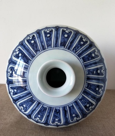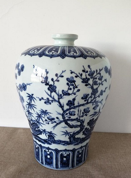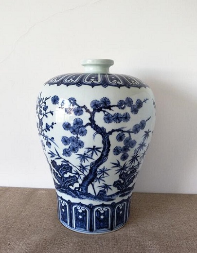 此瓶器型敦厚,以岁寒三友图为饰。画面以翠蓝色的青花绘梅树枝干、松针、竹及山石,描绘苍老的松干和傲寒的梅花,此器所绘松竹梅“岁寒三友”图案是明清瓷器中常见的一种装饰题材。松树长青不老,竹有君子之风,梅花凌霜傲雪,古代文人骚客多以松竹梅的高风亮节自喻。整器纹饰繁密,层次分明,绘画笔法娴熟,青花色蓝不艳,属明代青花中之珍品。