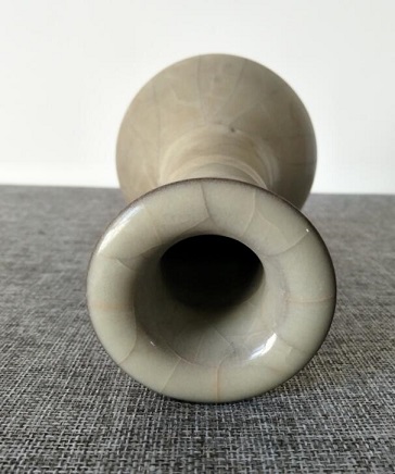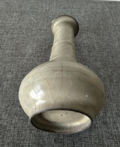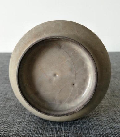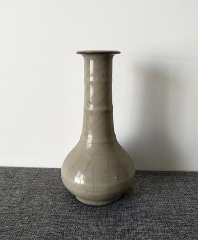 瓶平口,长颈,圆腹,矮圈足,颈至腹部有凸起弦纹三道。瓶通体以月白釉为饰,釉层肥厚,釉汁莹润,具有凝厚深沉的玉质美。简洁雅致,凸起的弦纹改变了造型的单调感,增强了器物的装饰性。器身布满大片纹,纵横交错,是宋代官窑瓷器的典型作品。