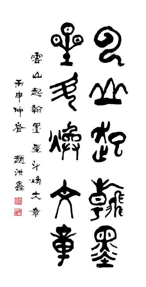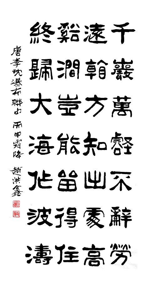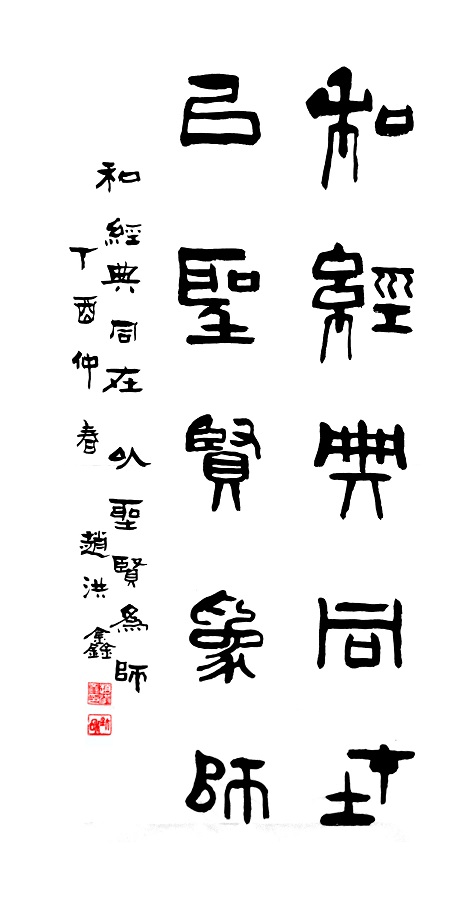 赵洪鑫,男,汉族,一九四二年生,山东省章丘市人。自幼酷爱书法,临池不辍,由唐楷入手,作品追求规范和谨严、崇尚灵秀、遒厚古朴、风格鲜明,在挥洒自如的创作中不失法度并彰显出深厚的师法古人之功力。现为:中国投资协会投咨委文化艺术品投融资中心顾问、中国管理科学研究院学术委员会特约研究员、中央国家机关书法家协会会员、全国名人书画界联合会主任委员、文化部中华儿童文化艺术促进会第二届全国美术摄影大赛评委。